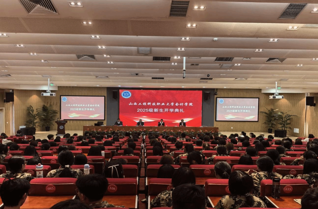 2025年9月20日下午,山西工程科技职业大学会计学院2025级新生开学典礼在东区图书馆报告厅内隆重举行。学院党委书记郭卫红、副院长(主持工作)王 晨、副院长曹宇波出席会议,全体教职工及2025级全体新生共同见证了这一重要时刻。典礼由学院党委副书记王虎威主持。