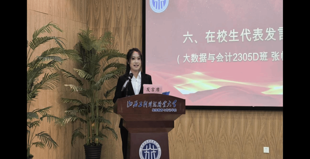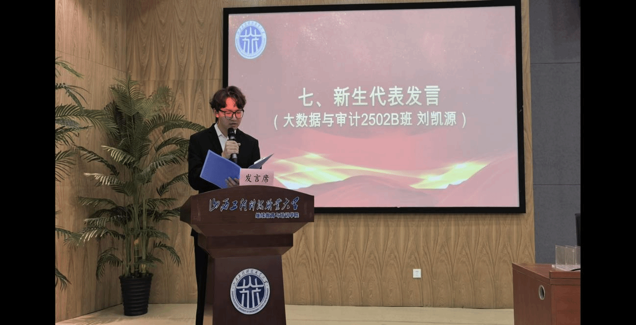 大数据与审计2502B班的刘凯源代表全体新生同学则表达了珍惜学习机会、尽快融入大学生活、恪守校规校纪、努力钻研专业知识的决心和愿望。