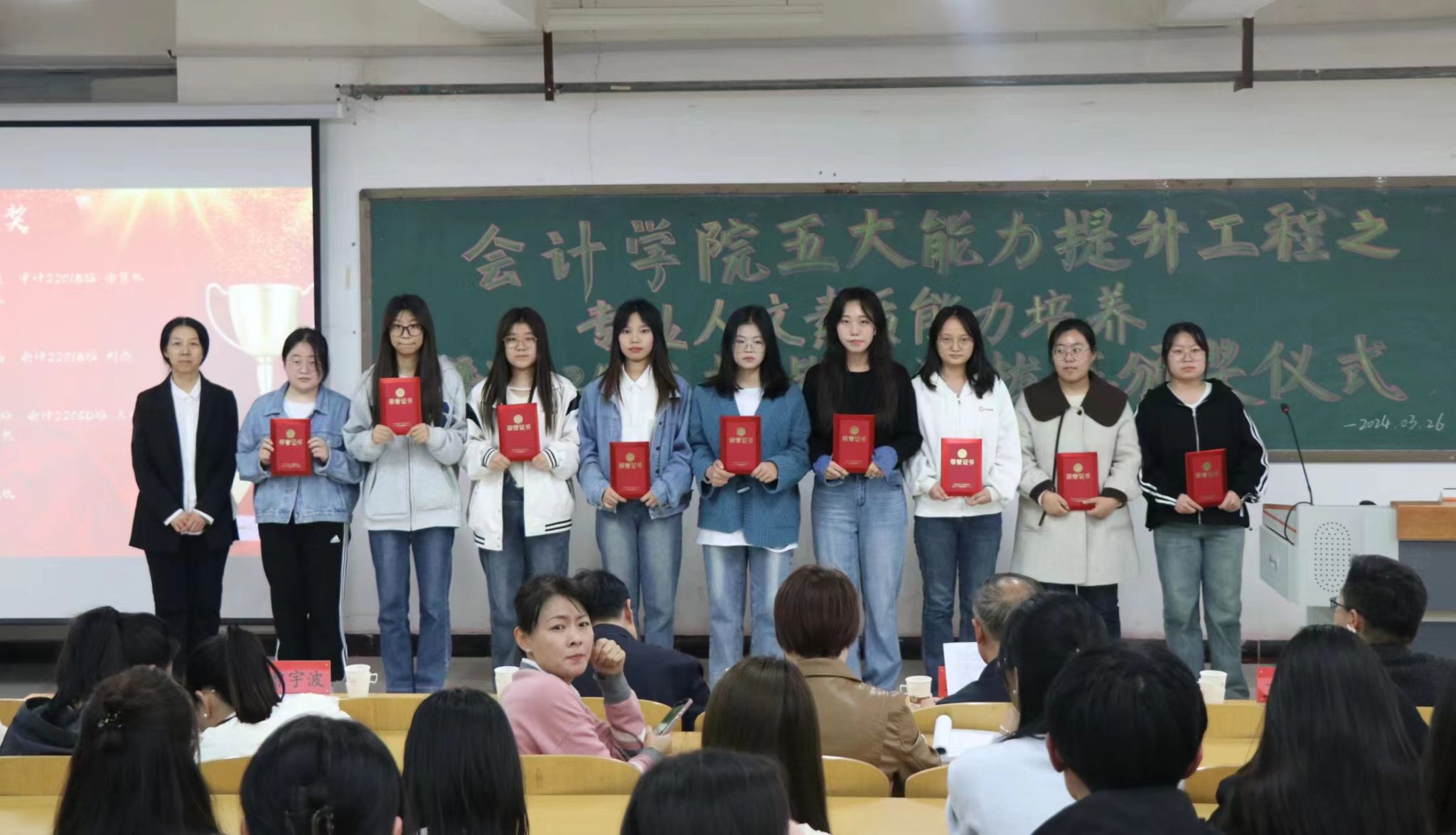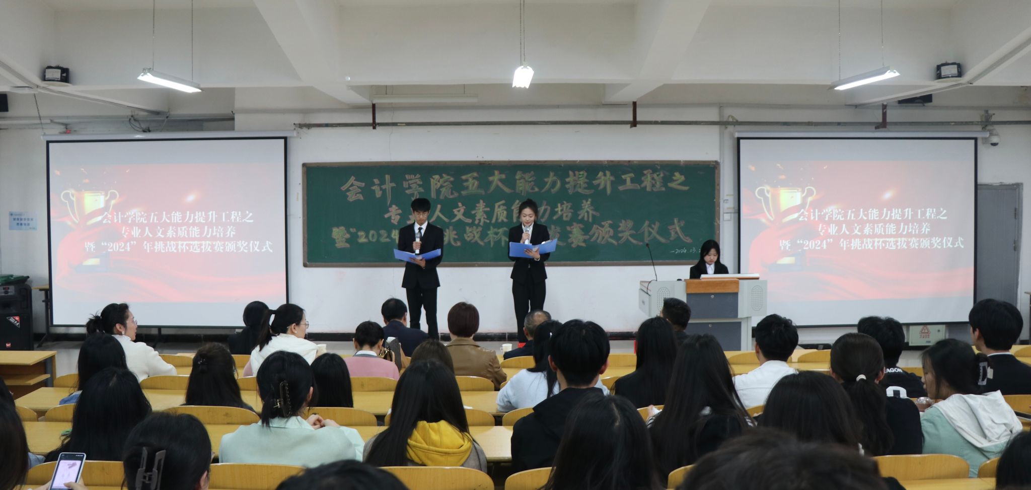 为了深入贯彻党的教育方针,着力于促进课外学术活动的蓬勃开展,更好地发现和培养一批在学术科技上有作为、有潜力的优秀人才,会计学院于2024年3月26日在8号教学楼T12教室举行“五大能力”提升工程之专业人文素质能力培养暨2024年“挑战杯”选拔赛颁奖仪式。活动旨在引导和激励同学们实事求是、刻苦钻研、勇于创新、多出成果、提高素质,勇毅前行。参加此次会议的有会计学院党委书记郭卫红、党委第二负责人、教学行政第二负责人(主持工作)王辛平、党委副书记王虎威、副院长曹宇波以及各位指导老师和同学们近150人。