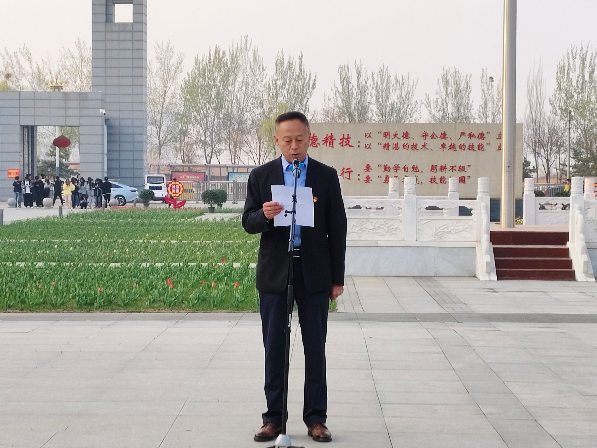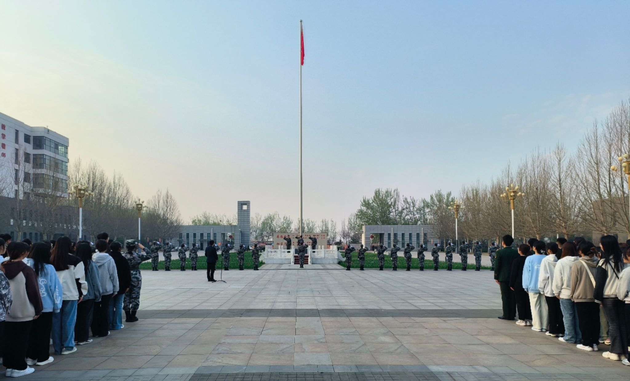 24名国旗护卫队成员护卫国旗缓缓走来,在雄壮激昂的《义勇军进行曲》伴奏下,鲜艳的五星国旗迎着朝阳冉冉升起。全体人员庄严肃穆,面向国旗行注目礼。大数据与会计专业2301B班李源潮代表全体同学在国旗下作了题为《传承烈士遗志,积蓄青春力量》的演讲,表达了青年学生铭记革命烈士遗志,勇挑历史使命重担的真挚情怀;专职辅导员王嘉禄老师带领全体同学诵读人民英雄纪念碑碑文,150字的碑文表达了对中国爱国志士不屈抗争的崇高敬意,也为全体学生上了一堂以爱国主义教育为主题的思政课。